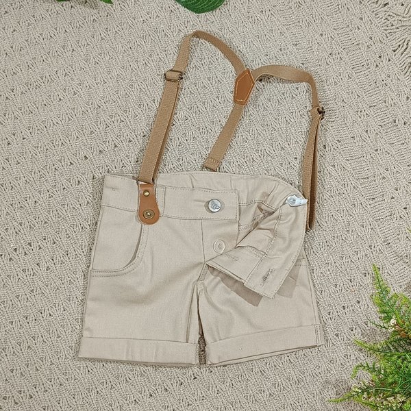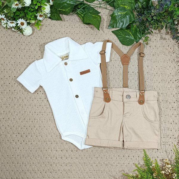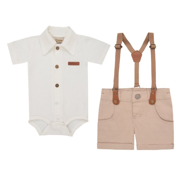 Conjunto Infantil Menino – Batizado com Body em Malha Tricô e Shorts em Sarja com Suspensório