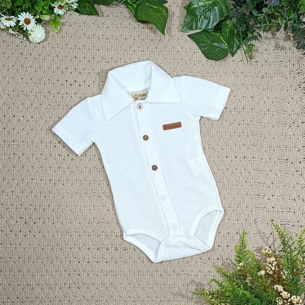 O body é confeccionado em malha tricô macia, com abertura frontal com casinha e botões em ouro velho, que