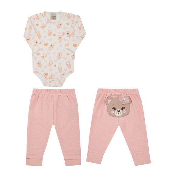 Conjunto Bebê Menina – Body em Suedine com Estampa Exclusiva e Calça Vira-Pé em Malha Tricô com Bordado