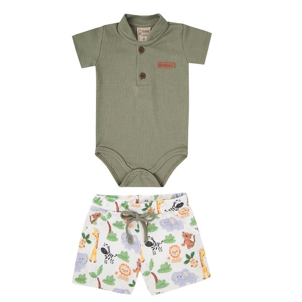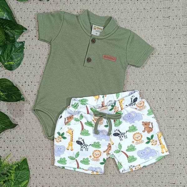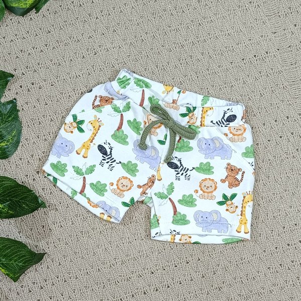 O shorts é feito em suedine com estampa exclusiva de safari, proporcionando um visual lúdico e divertido.