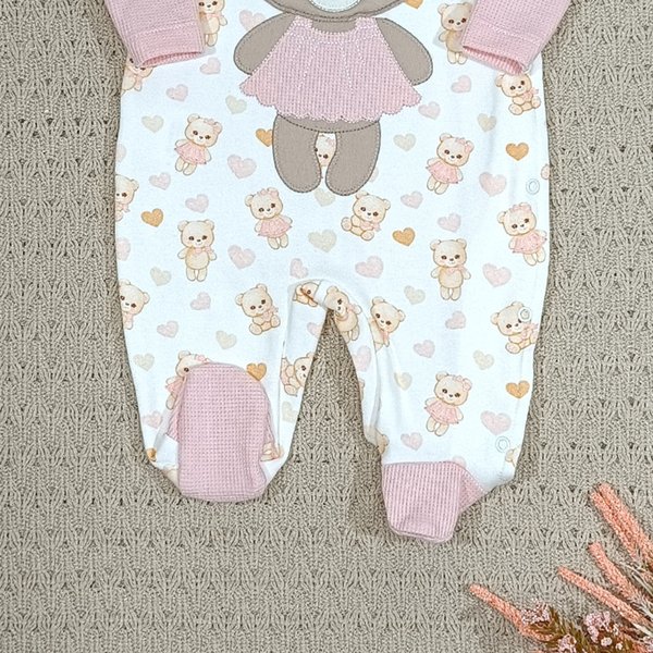 Macacão Jardineira Bebê Menina – Suedine com Estampa Exclusiva e Malha Tricô Rosa