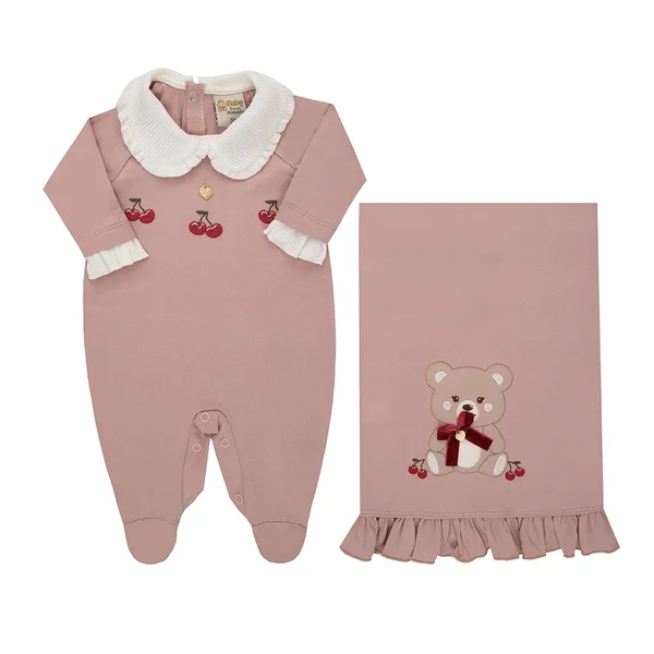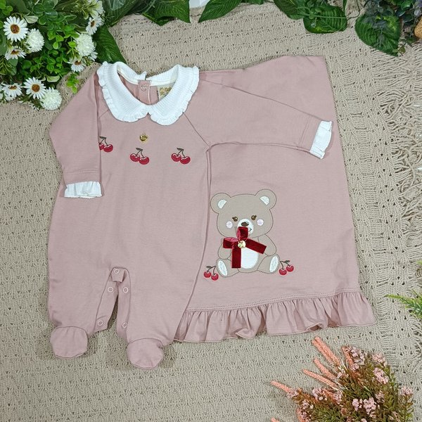 Saída Maternidade Bebê Menina – Macacão com Manta em Meia Malha e Malha Tricô