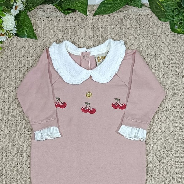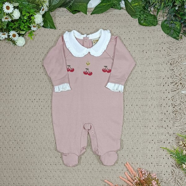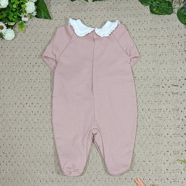 O macacão é confeccionado em meia malha macia, com detalhes em malha tricô na gola com babados e nas mangas, trazendo