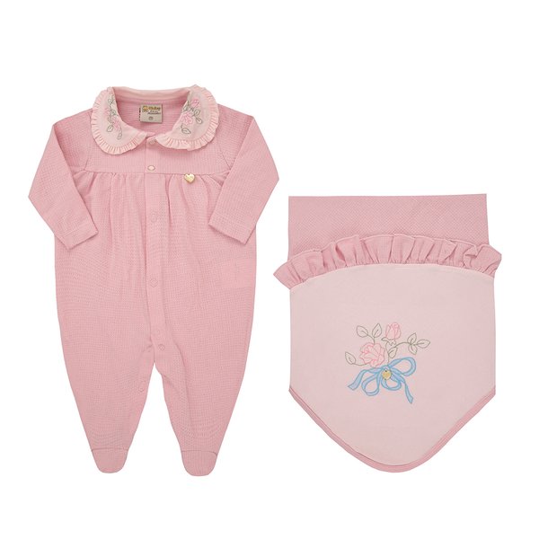 merece. O macacão é confeccionado em malha trabalhada 100% algodão, suave ao toque e ideal para a pele sensível do recém-nascido. A gola bordada com