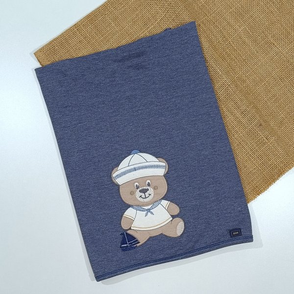A manta (80x80cm) acompanha a composição com bordado delicado e acabamento em viés no mesmo tecido do macacão, garantindo