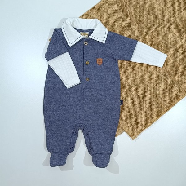 O macacão é confeccionado em piquet e malha canelada, tecidos leves e respiráveis que proporcionam aconchego e