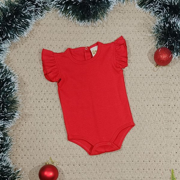 O conjunto acompanha body em suedine com babadinhos delicados nas mangas, garantindo conforto e um